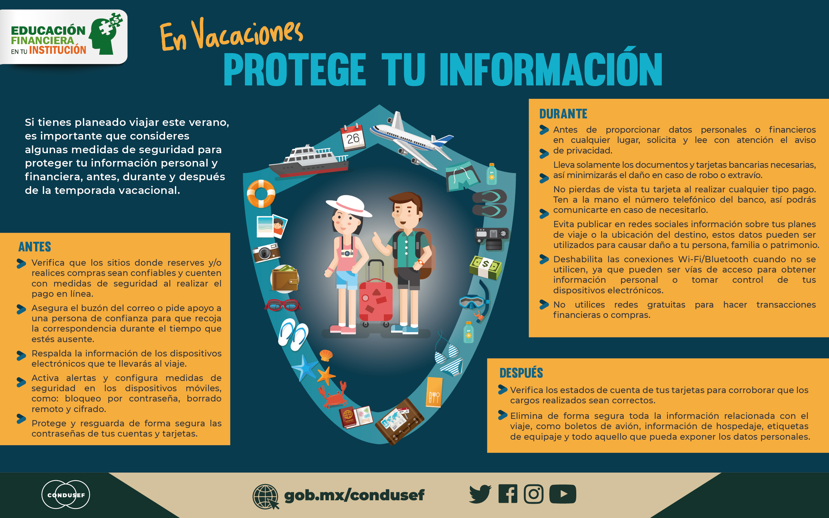 ¡Llegaron las vacaciones! Antes de que vayas de viaje, sigue estas recomendaciones para cuidar tu información personal y financiera en esta temporada.